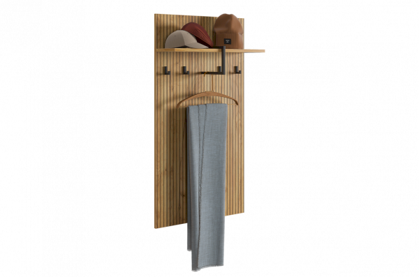 Принт, имитирующий вертикальную фрезеровку придает вешалке уникальный и современный вид, добавляя текстуру и глубину. Материал вешалки – ЛДСП, что обеспечивает прочность и долговечность, а также легкость в уходе.